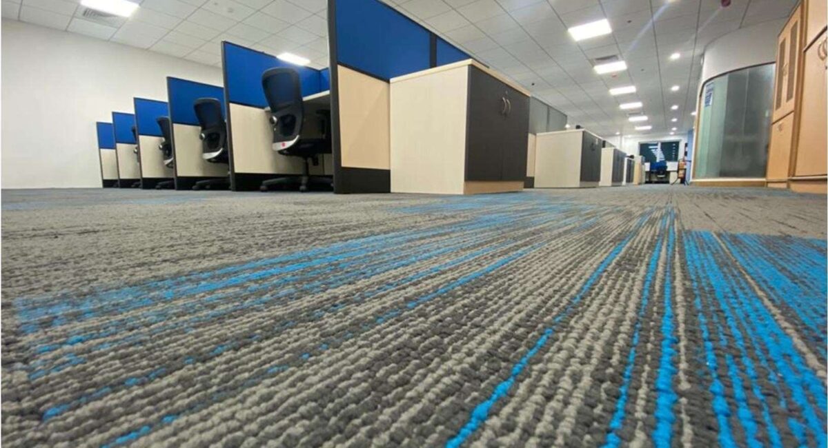- Color Palette: The primary color scheme is corporate and neutral, with white and light wood tones. This is accented by vibrant blue and grey panels on the cubicle dividers, adding a touch of color and visual distinction. The blue and grey carpet tiles complement this palette.
